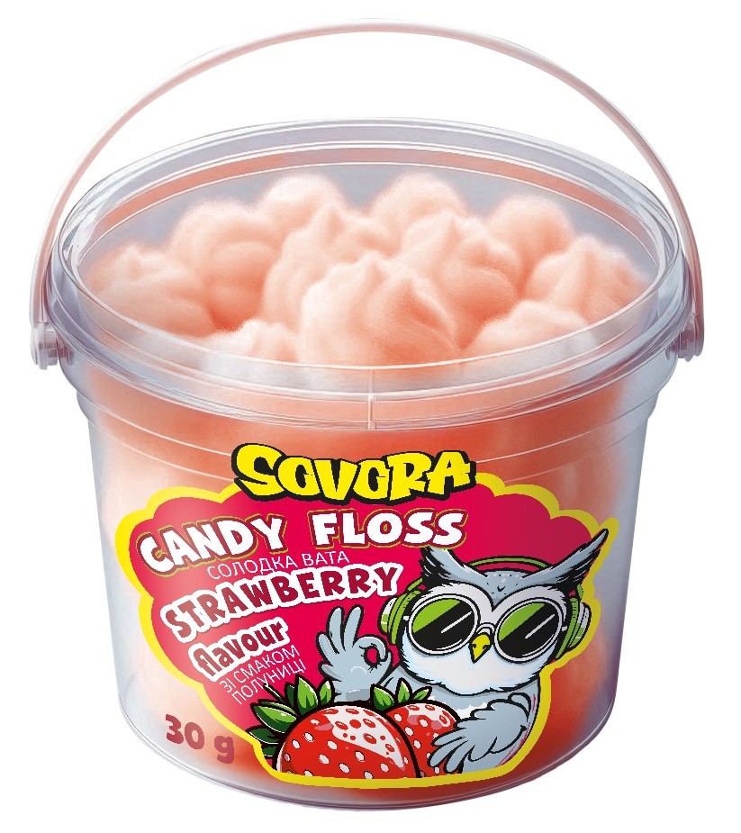 Cukrová vata SOVORA s jahodovou příchutí je lehká a nadýchaná sladkost známá z dětství. Je vyrobena z cukru s přídavkem aromatu a má výraznou jahodovou chuť a atraktivní barvu.