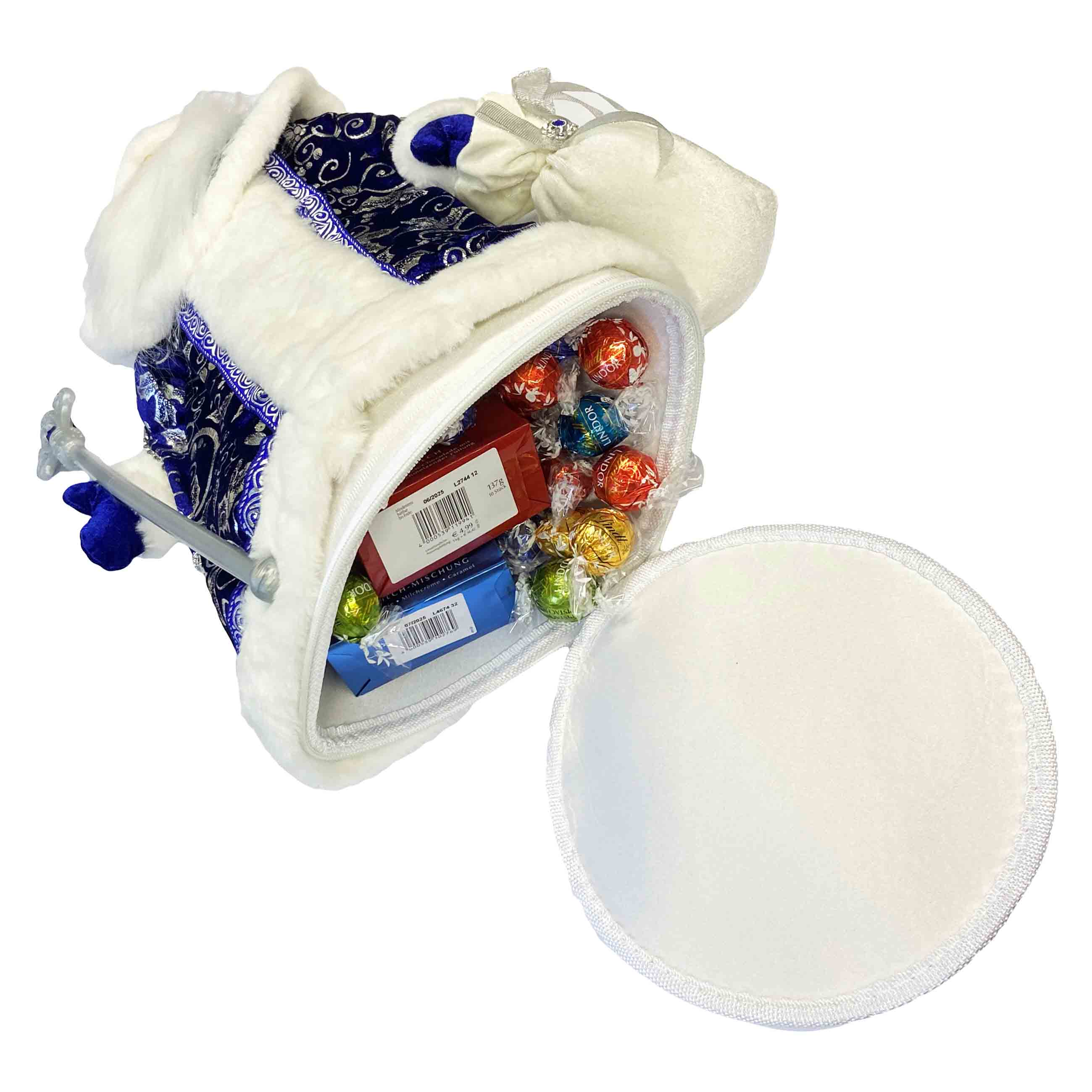 Figurka Děda Mráze v modro-bílé se stříbrem, s oddělením na cukrovinky a dárky, 50 cm