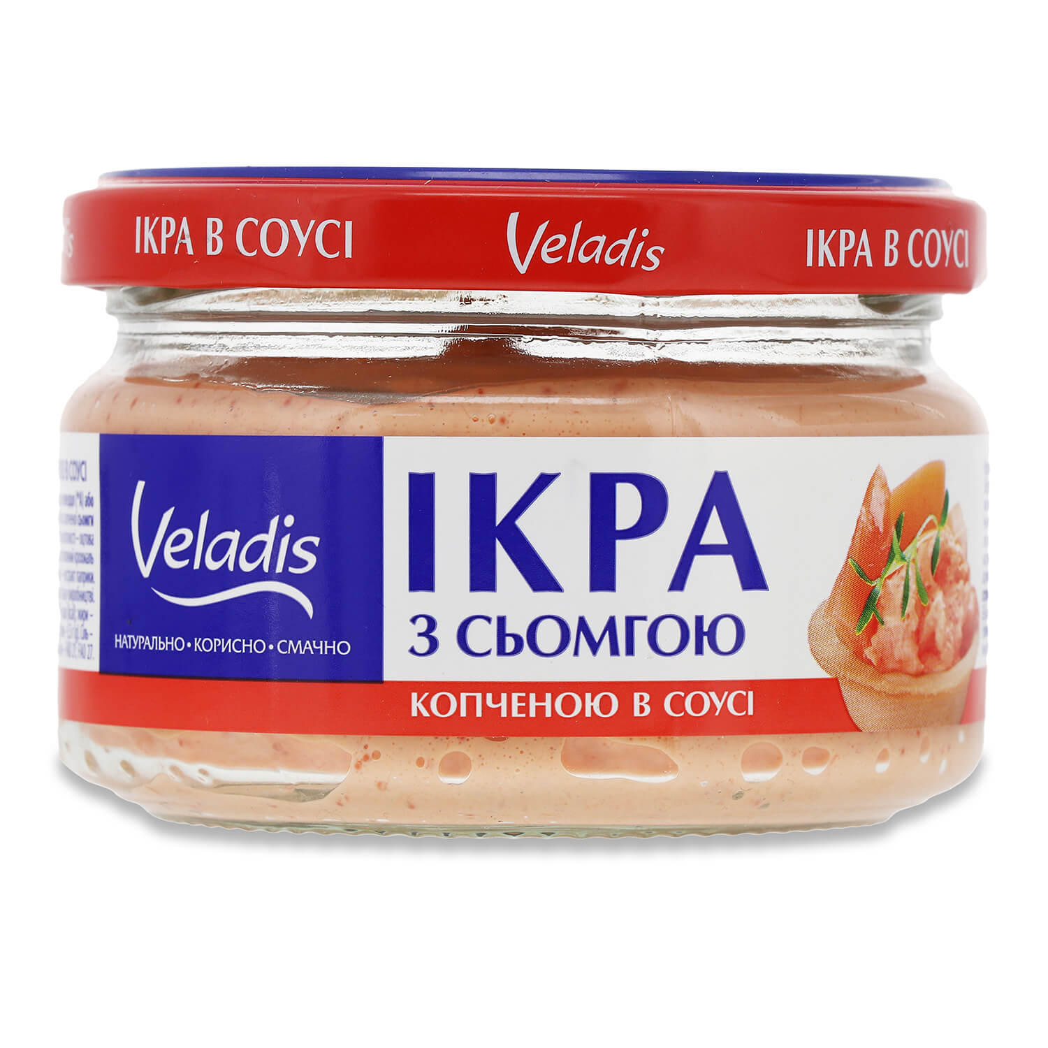 Složení: jikry z huňáček severní, slunečnicový olej, maso z lososa uzený (maso z lososa, Kouř), pitná voda, cukr, jedlá sůl, regulátor kyselosti: (E260), sušené žloutky, zahušťovadlo: (E1420, E415, E412), konzervant: (E202, E211), barvivo: (E160c).
