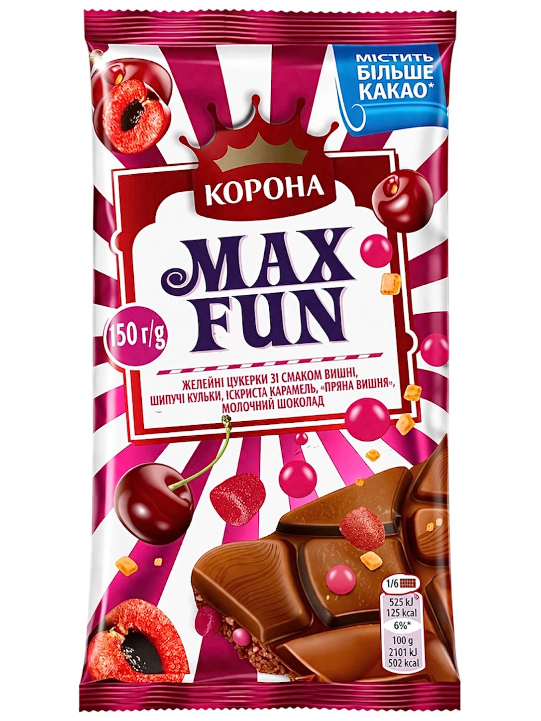 Mléčná čokoláda MAXFUN „Pikantní višeň“ 150g KORONA