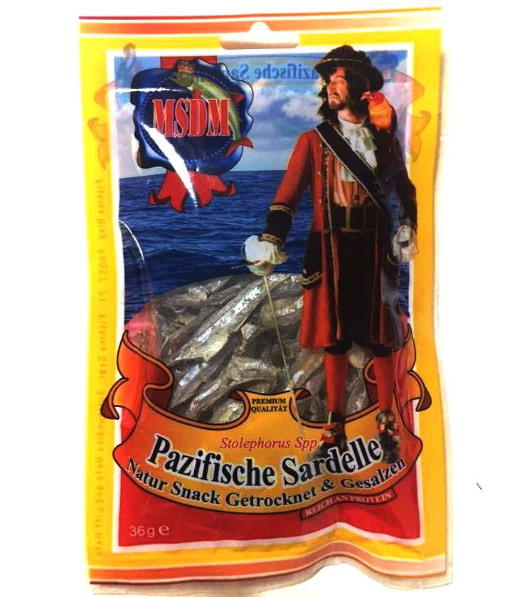Složení: sušené ančovičky (Stolephorus spp) )97 %, sůl, ztužovač sorbitol.